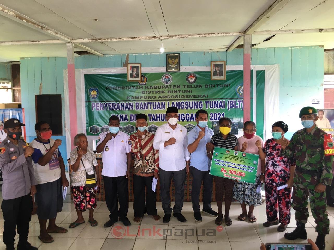BINTUNI, Linkpapuabarat.com- Pemerintah Kabupaten Teluk Bintuni menyalurkan bantuan langsung tunai (BLT) 2021 kepada 202 kepala keluarga di Kampung Argosigemerai Sp5, Distrik Bintuni. Penyaluran dilakukan secara simbolik mulai, Rabu (24/2/2021).