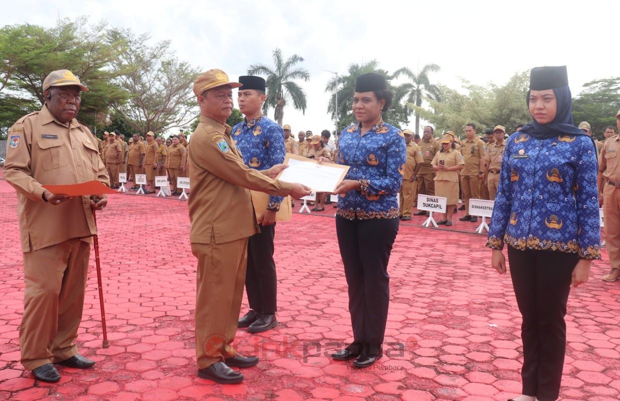 MANOKWARI, LinkPapua.id – Sebanyak lima lulusan Institut Pemerintahan Dalam Negeri (IPDN) angkatan 32 resmi menerima Surat Keputusan (SK) pengangkatan CPNS dari Kementerian Dalam Negeri (Mendagri). SK tersebut diserahkan Asisten III Setda Papua Barat, Otto Parorongan, saat apel gabungan di Kantor Gubernur Papua Barat, Senin (27/10/2025).