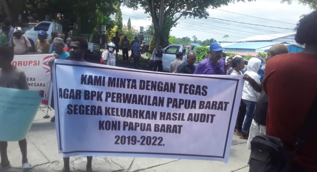 Massa membentangkan spanduk bertuliskan desakan kepada BPK.Tak hanya soal kasus KONI, BPK juga diminta menindaklanjuti audit sejumlah indikasi penyalahgunaan keuangan negara di wilayah Papua Barat.