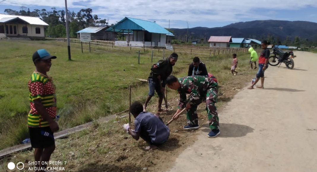 ARFAK, Linkpapua.com – Babinsa Koramil persiapan Hingk Sertu Catur dan Koptu Deni memimpin kerja bakti bersama masyarakat di Kampung Hingk, Kabupaten Pegunungan Arfak, Papua Barat, Minggu (28/11/2021). Babinsa mengajak warga bergotong royong merawat jalan kampung.