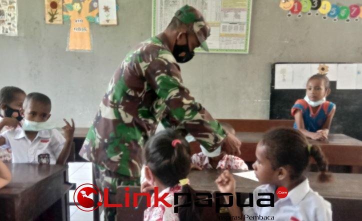 MANOKWARI, Linkpapua.com – Babinsa Kampung Guintuy Koramil 1801-03/Warmare Serka Sarifuding, meninjau langsung pelaksanaan pembelajaran tatap muka (PTM) terbatas, di SD Negeri Guintuy, Distrik Warmare, Kabupaten Manokwari, Papua Barat, Senin (22/11/2021). Pemantauan untuk memastikan berjalannya protokol kesehatan selama PTM.