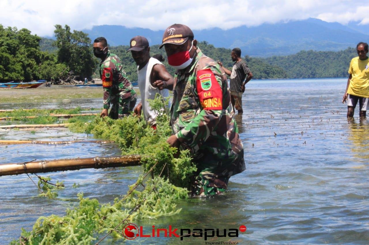 WASIOR, Linkpapua.com- Komando Rayon Militer (Koramil) 1801-04/Wasior dipimpin langsung Danramil, Kapten Inf Katwadi gelar panen perdana rumput laut bersama Dinas Perikanan dan masyarakat di Kampung Asandami Distrik Teluk Duairi, Kabupaten Teluk Wondama, Provinsi Papua Barat, Rabu (28/04/2021).