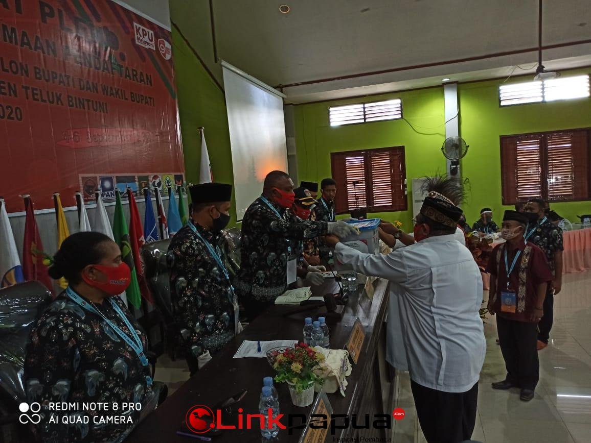 penyerahan dokumen oleh pasangan PMK 2 kepada komisioner KPU untuk diverifikasi, Minggu (6/9/20) di gedung aula KPU Teluk Bintuni.