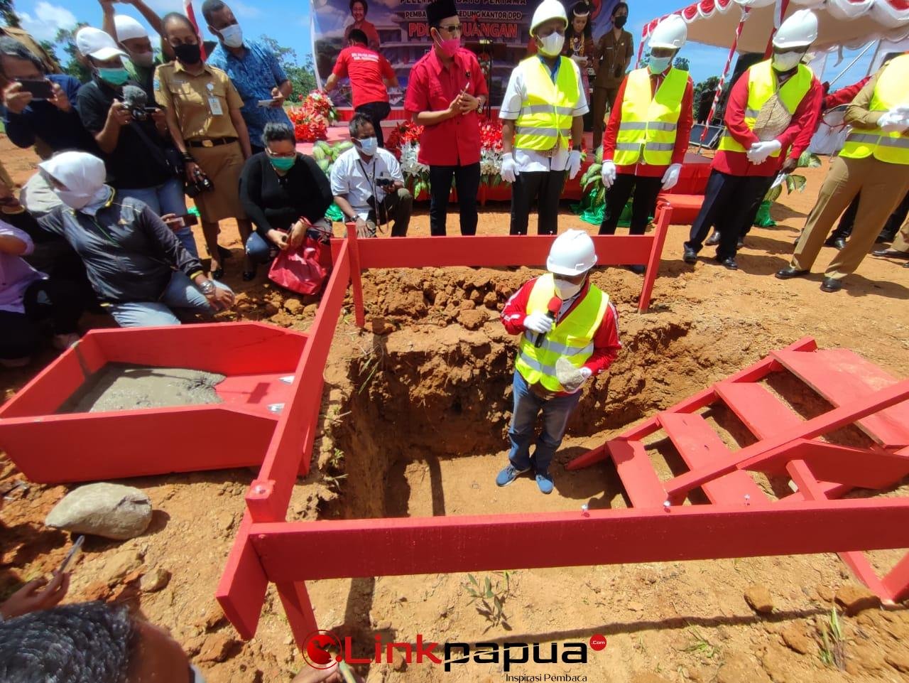 MANOKWARI,Linkpapua.com- Pembangunan gedung sekretariat PDI Perjuangan Papua Barat dimulai, Selasa (4/5/2021). Pembangunan ini ditandai dengan peletakan batu pertama oleh Ketua DPP PDI Perjuangan Bidang Kehormatan, Komaruddin Watubun.