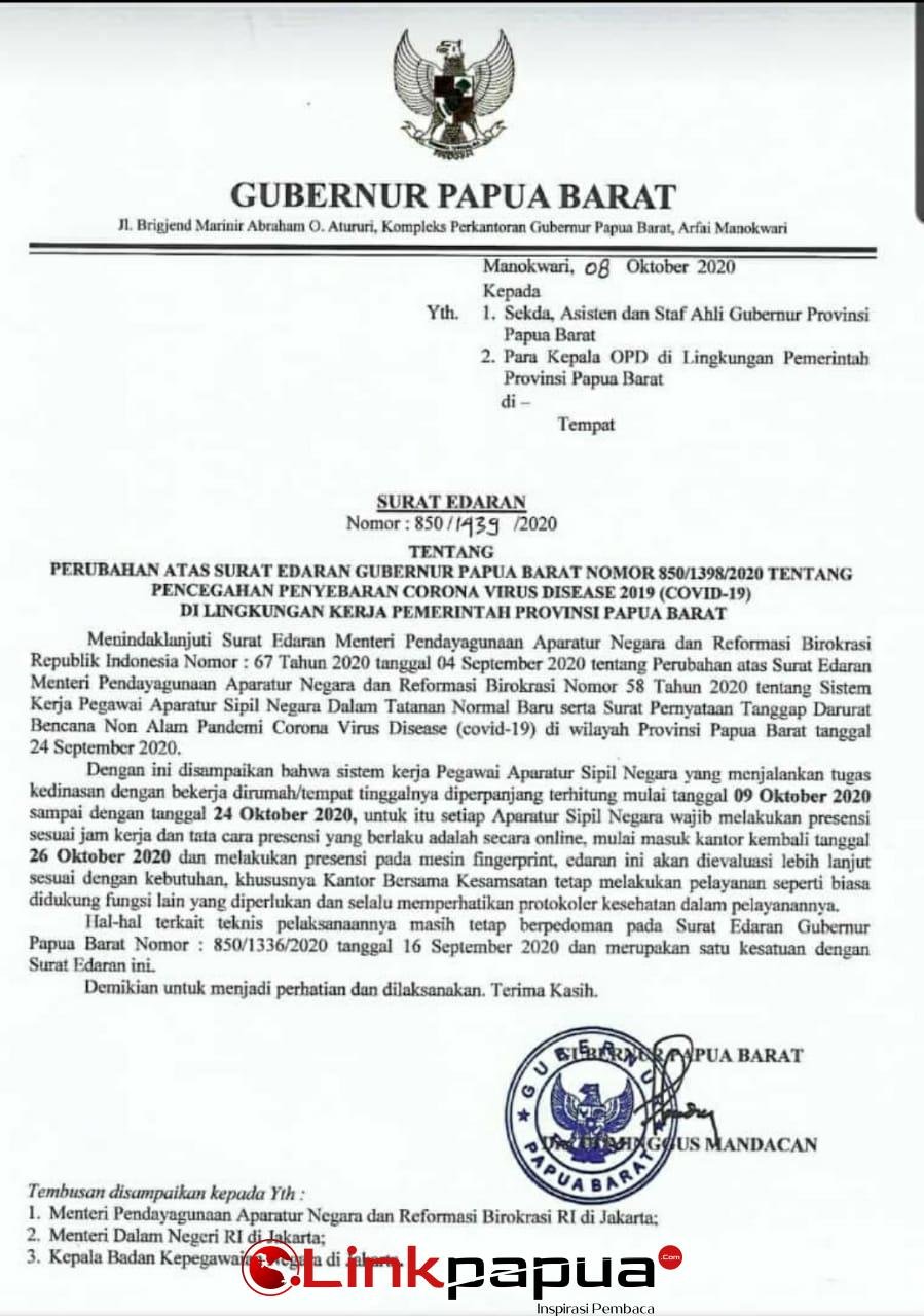 Instruksi tersebut terdapat dalam surat edaran Gubernur Papua Barat nomor 850/1439 / 2020 tanggal 08 Oktober 2020 tentang Perubahan Atas Surat Edaran Nomor 850/ 1398/ 2020 tentang Pencegahan Penyebaran Disease (COVID-19) di lingkungan kerja pemerintah Provinsi Papua Barat.