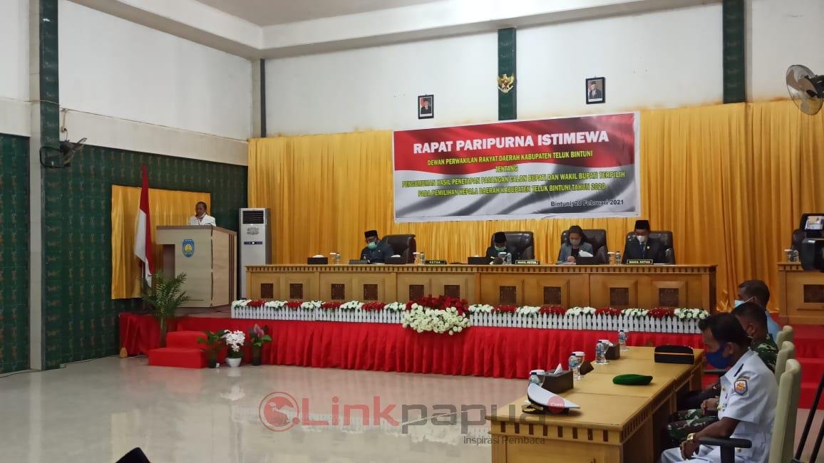 BINTUNI, Linkpapuabarat.com- DPRD Teluk Bintuni bulat menyatakan pasangan Petrus Kasihir-Matret Kokop sebagai bupati dan wakil bupati terpilih. Putusan ini dihasilkan dalam rapat pleno yamg berlangsung, Jumat sore (26/2/2021).