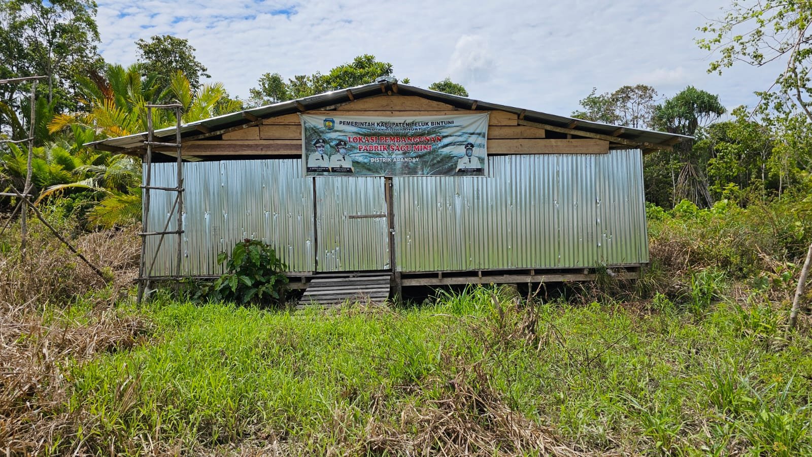 Pabrik berdiri dengan dinding dan atap dari seng. Pada dinding atas bagian depan, masih tertempel spanduk bertuliskan “Lokasi Pembangunan Pabrik Sagu Mini”, dengan gambar Petrus Kasihiw – Matret Kokop, Bupati dan Wakil Bupati Teluk Bintuni.