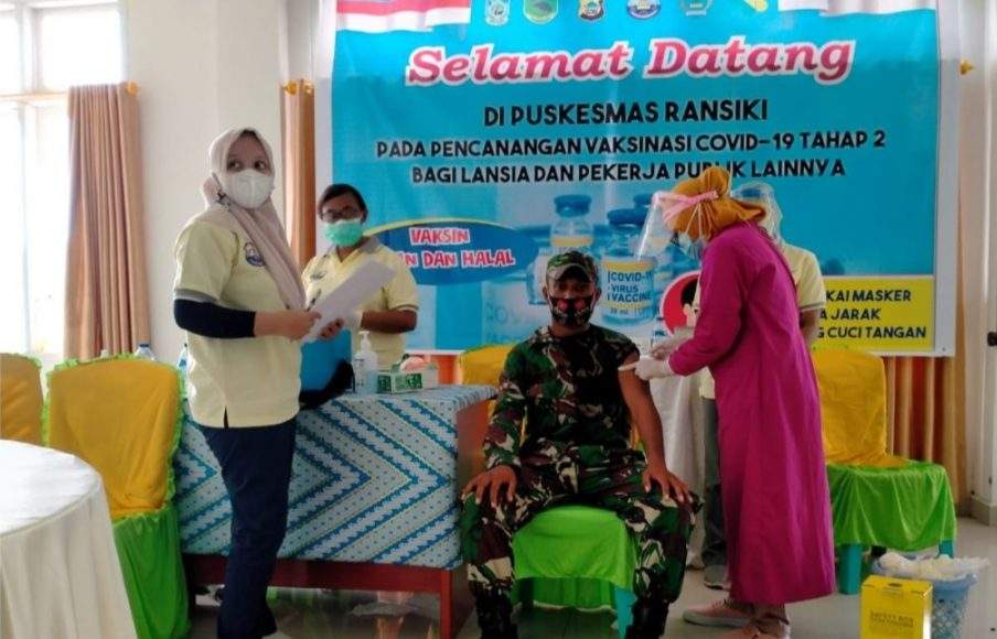 Sejumlah anggota TNI dan Polri antusias untuk mengikuti vaksinasi. Peserta yang mendaftar dibagian registrasi sebanyak 68 orang, namun saat melewati tahap screening, satu peserta dinyatakan tidak lolos, sehingga yang bisa mengikuti vaksinasi hanya 67 orang.