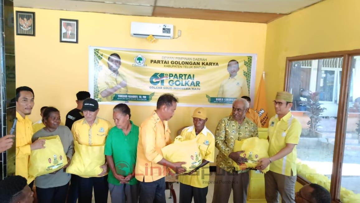 TELUK BINTUNI, LinkPapua.id – DPD Partai Golkar Kabupaten Teluk Bintuni, Papua Barat, membagikan 1.000 paket sembako kepada masyarakat dan panti asuhan untuk merayakan HUT ke-61 partai berlambang pohon beringin tersebut. Kegiatan ini digelar di Sekretariat Golkar Teluk Bintuni, Distrik Bintuni, Sabtu (18/10/2025).