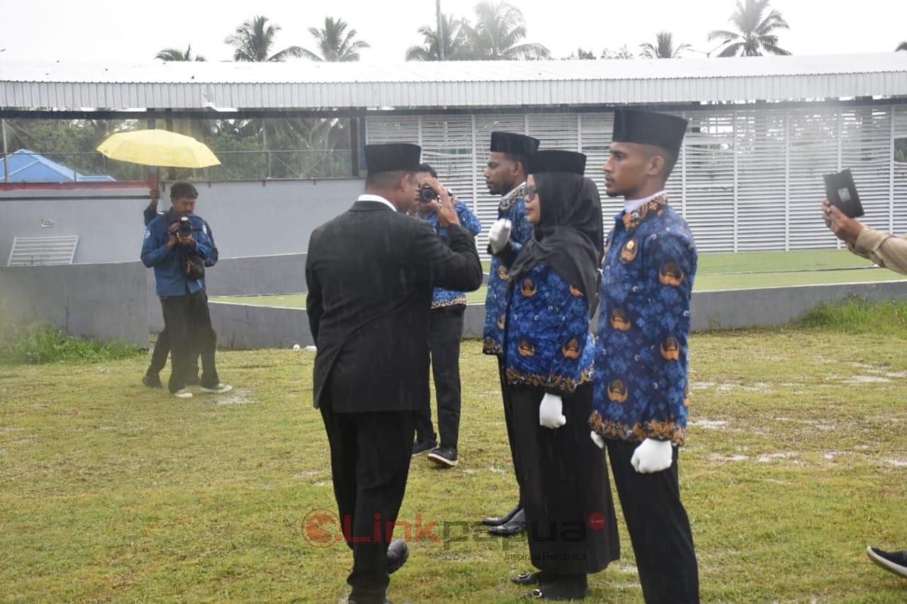 Upacara peringatan Hari Pahlawan di Teluk Bintuni digelar di alun-alun Argosigemerai SP 5, Distrik Bintuni Timur, Senin (10/11/2025). Meski diguyur hujan deras, upacara tetap berlangsung khidmat dan penuh semangat.