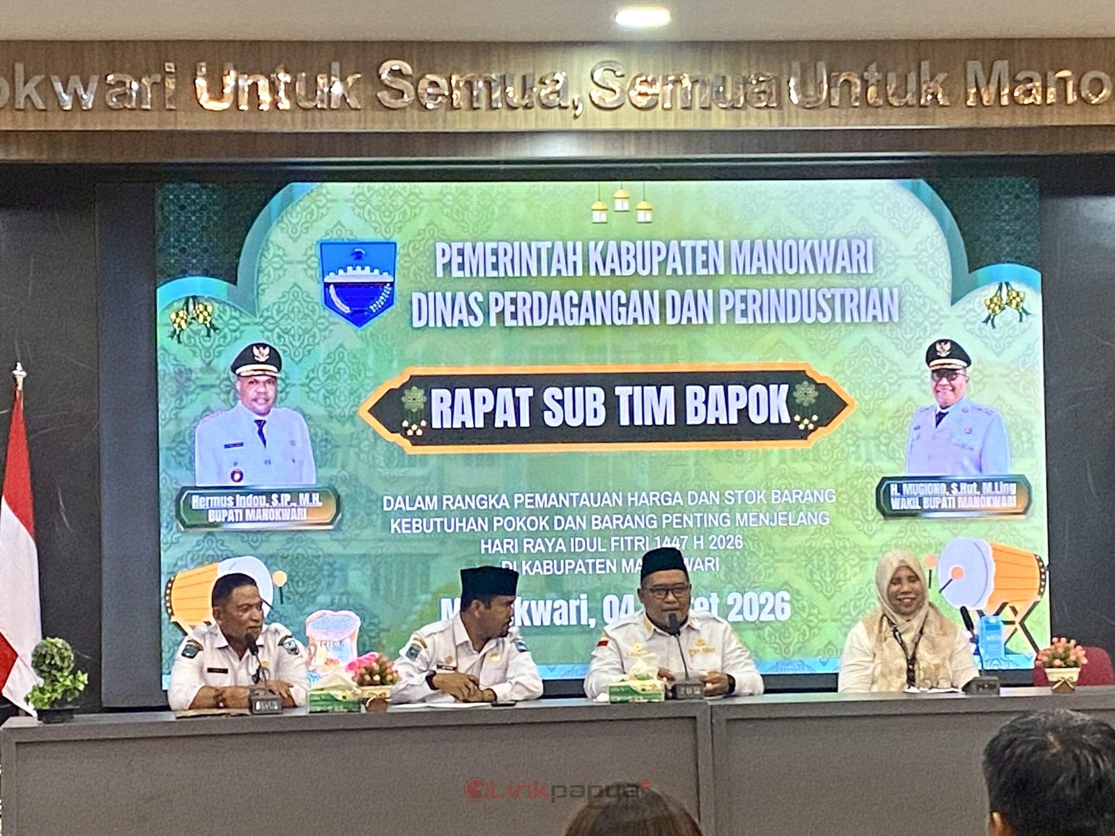 MANOKWARI, Linkpapua.id-Pemerintah Kabupaten Manokwari menggelar pertemuan dengan sejumlah instansi dan distributor sembako di Manokwari pada Rabu (4/3/2026). Rapat tersebut sebagai langkah antisipasi menjaga ketersediaan bapok dan stabilitas harga jelang Idul Fitri 1447 Hijriah.