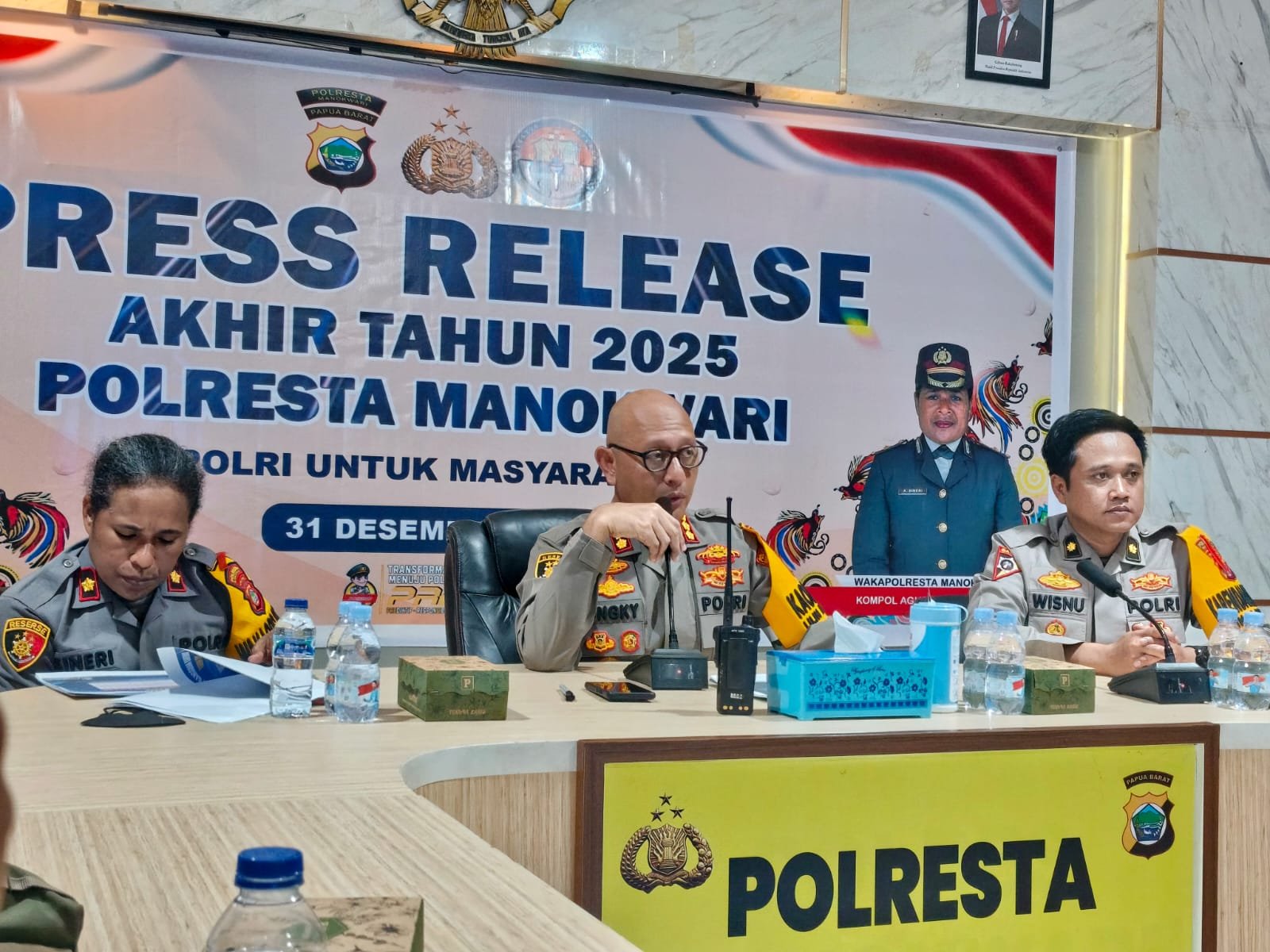 “Berdasarkan data gangguan kamtibmas, pada tahun 2024 tercatat sebanyak 927 kasus kejahatan, sementara pada tahun 2025 meningkat menjadi 1.419 kasus atau naik sebesar 53 persen,” ujar Kapolresta Manokwari Kombes Pol Ongky Isgunawan dalam press release akhir tahun, Rabu (31/12/2025).
