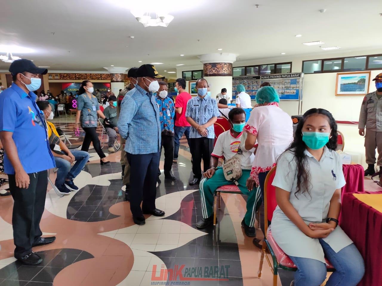 MANOKWARI, Linkpapua.com – Gubernur Papua Barat Dominggus Mandacan meninjau langsung pelaksanaan vaksin Covid-19 massal bagi seluruh ASN dan warga di kantor gubernur, Kamis 22 April 2022. Gubernur memuji kesiapan proses vaksinasi yang dinilai sangat baik.