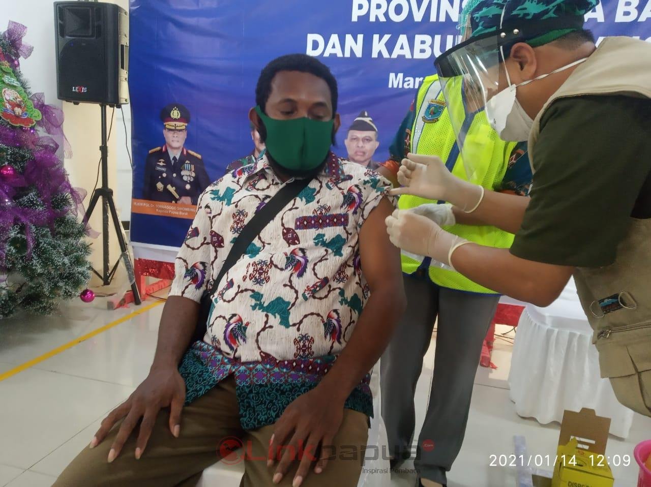 MANOKWARI, Linkpapuabarat.com- Ketua Dewan Adat Papua (DAP) Wilayah III/Domberai, Papua Barat, Zakarias Horota ikut menjalani penyuntikan vaksin pada pencanangan program vaksinasi COVID-19 di Manokwari, Kamis (14/1).