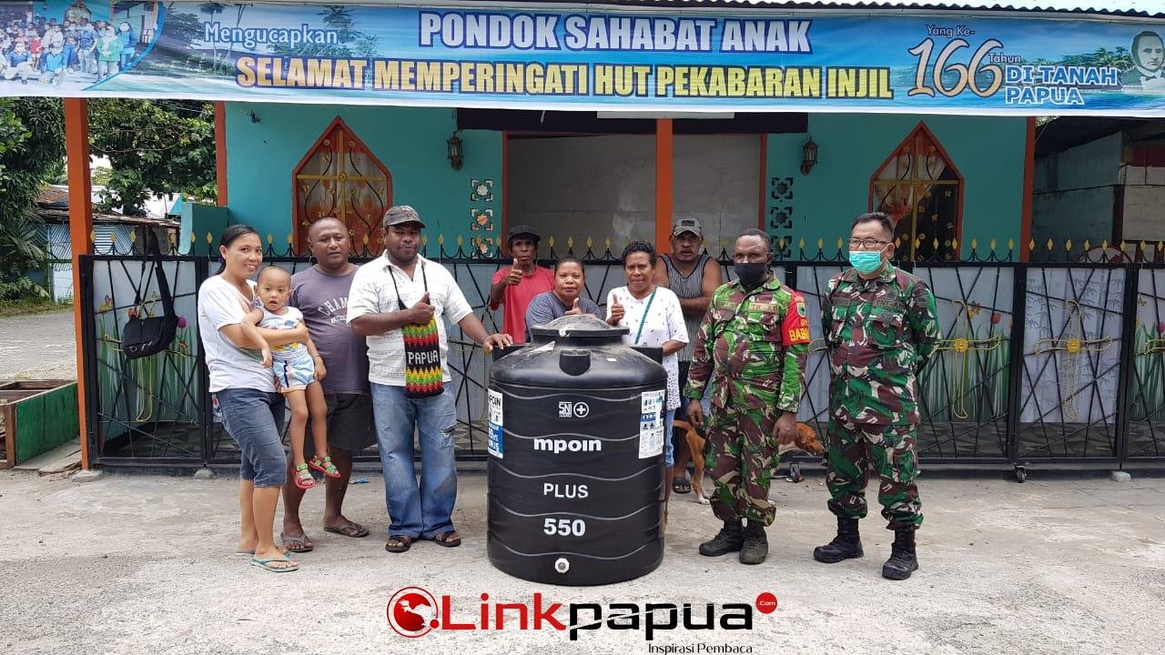 MANOKWARI,Linkpapua.com- Danramil 1801-01/Manokwari Mayor Inf D Mendrofa bersama Babinsa Sanggeng menyalurkan bantuan profil tank air kepada Pondok Sahabat Anak di Sanggeng, Kabupaten Manokwari, Minggu (02/05/2021). Bantuan diberikan untuk mengatasi ketersediaan air bersih di daerah itu.