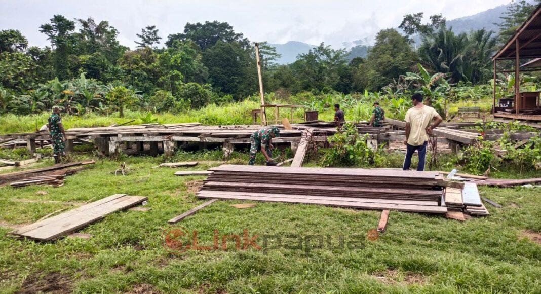 TELUK BINTUNI, LinkPapua.com – Koramil 1806-04/TB Distrik Wamesa menggelar karya bakti dengan bergotong royong membangun rumah layak huni di Kampung Idoor, Sabtu (30/9/2023). Kegiatan ini dipimpin Lettu Caj. Yotam dan Serda Mayowa, bersama anggota TNI lainnya.