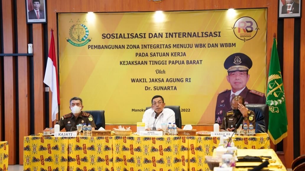 “Mewujudkannya bukan sebuah pekerjaan yang mudah sehingga dapat diwujudkan melalui semangat reformasi birokrasi,” ujar Sunarta saat memberikan arahan dalam sosialisasi selaku ketua tim pengarah reformasi birokrasi pada satuan kerja Kejati Papua Barat, Kamis (15/9/2022).