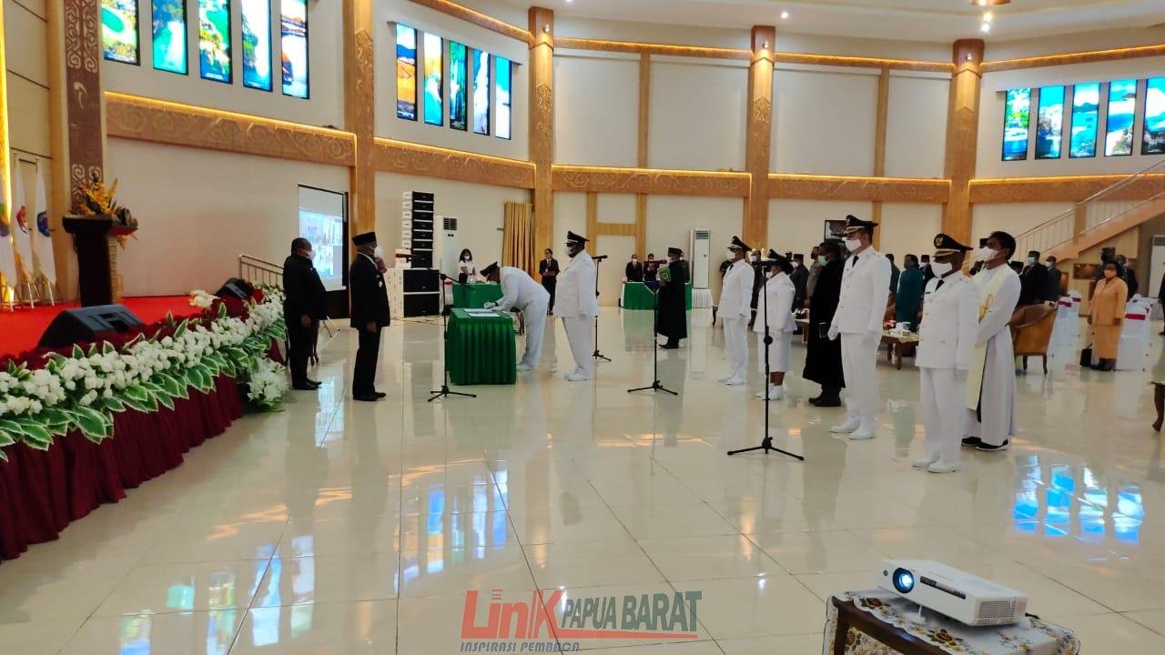 MANOKWARI, Linkpapua.com, Gubernur Papua Barat, Dominggus Mandacan resmi melantik tiga pasangan Kepala Daerah secara virfual dan hibryd, Senin (26/4/2021) di Auditorium PKK Arfai.