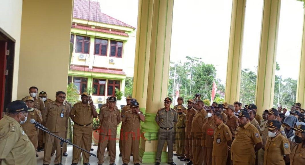 BINTUNI, Linkpapua.com – Wakil Bupati Teluk Bintuni, Matret Kokop, memimpin apel gabungan seluruh jajaran Pemerintah Kabupaten (Pemkab) Teluk Bintuni di halaman Kantor Bupati Teluk Bintuni, Distrik Menimeri, Senin (28/8/2022).