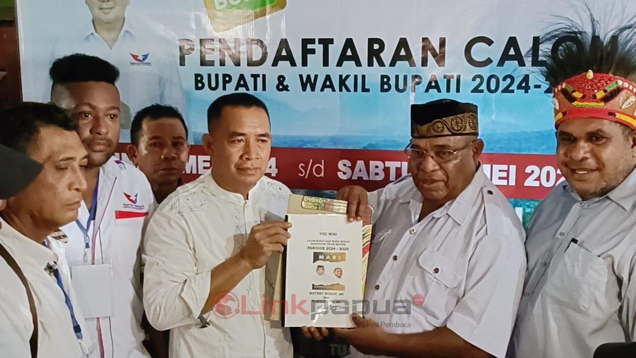 TELUK BINTUNI, LinkPapua.com – Pasangan bakal calon bupati dan wakil bupati Teluk Bintuni, Matret Kokop-Ronald Isir, mengantar formulir pendaftaran mereka di Sekretariat Partai Perindo Teluk Bintuni, Tahiti, Jumat (10/5/2024).