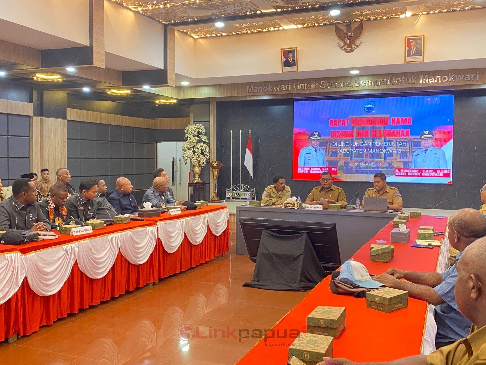 Dalam penyampaiam Bupati yang diwakili oleh Wakil Bupati Manokwari Mugiyono menyampaikan perunahan nama distrik dan kelurahan yang ada di Manokwari menjadi salah satu prioritas dimasa 100 hari kerja pemerintahan Hermus Indou-Mugiyono.