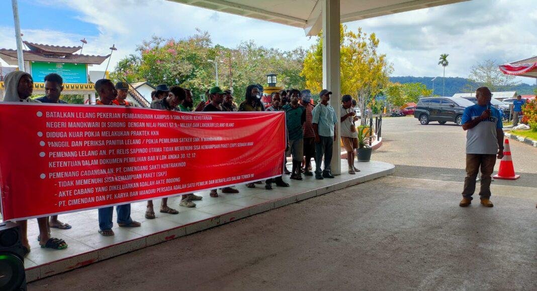 MANOKWARI, linkpapua.com– Puluhan massa dari kalangan pengusaha orang asli Papua (OAP) berunjuk rasa di Kantor Kejati Papua Barat, Manokwari, Selasa (12/9/2023) siang. Mereka mendesak Kejati mengusut dugaan penyimpangan dalam proses lelang proyek pembangunan Kampus II SMK Kehutanan Negeri Manokwari di kota Sorong.