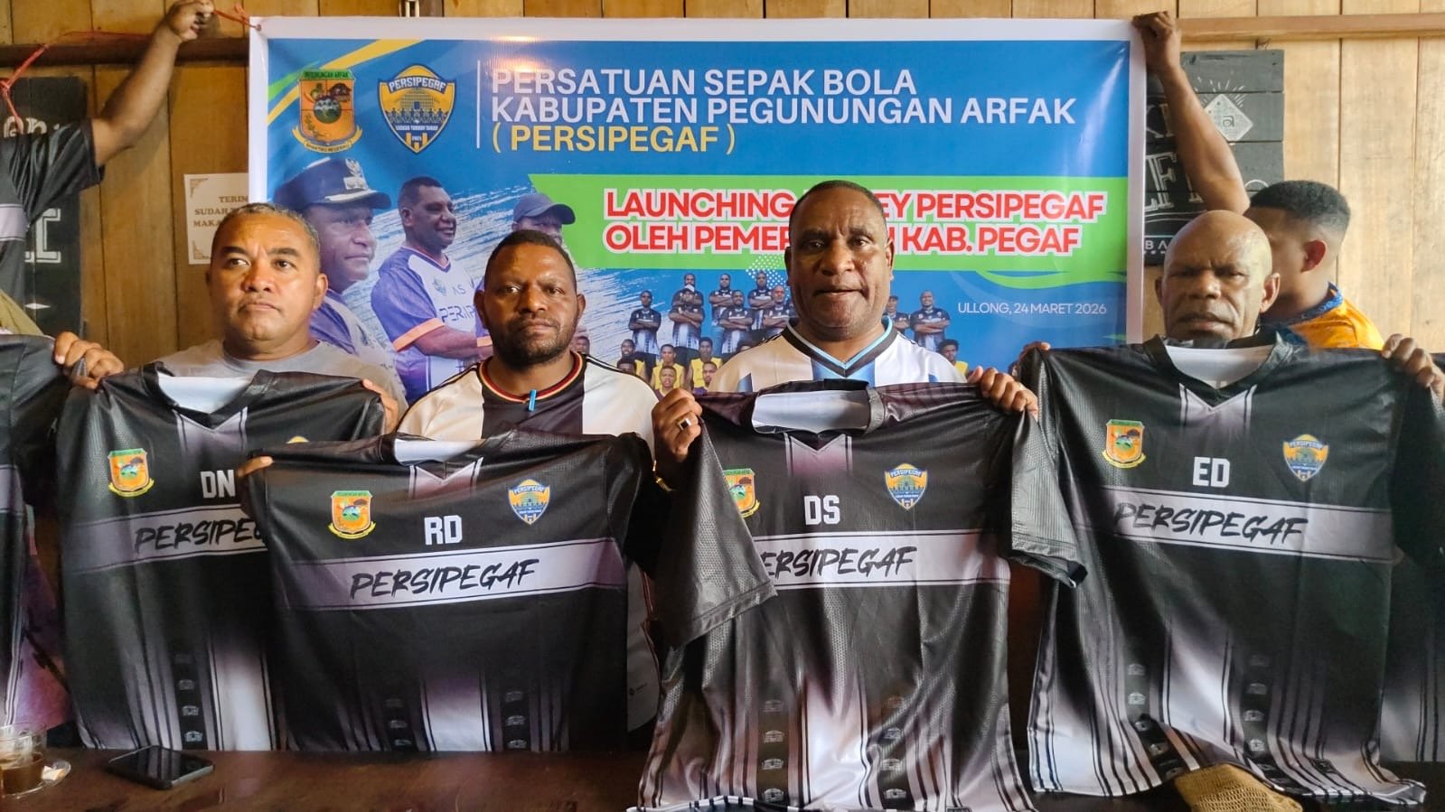 MANOKWARI, Linkpapua.id-Bupati Kabupaten Pegunungan Arfak, Dominggus Saiba S.Pd.K., M.Si bersama Sekretaris Daerah, Ever Dowansiba S.IP, M.Si resmi melauncing jersey baru tim kebanggaan masyarakat Pegunungan Arfak, Persipegaf FC di Cafe Manokwari, Selasa (24/3/2026).