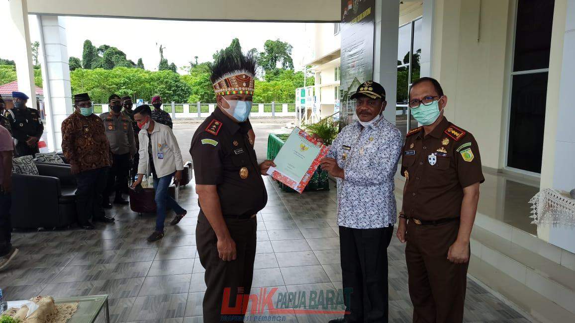 Dalam kesempatan itu Bupati Petrus Kasihiw menyerahkan sertifikat tanah Kejaksaan Negeri Teluk Bintuni kepada Kajati Papua Barat W Lingitubun. (LP5/red)