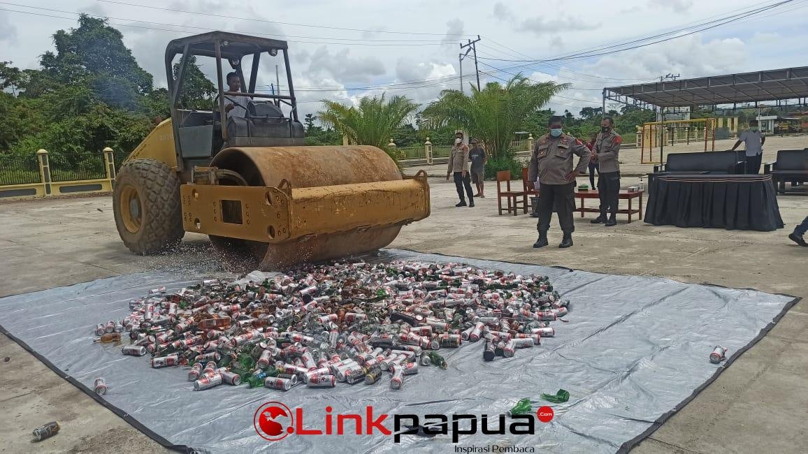 BINTUNI, linkpapua.com- Polres Teluk Bintuni melakukan pemusnahan barang bukti berupa ratusan botol minuman keras berbagai jenis, di halaman Mapolres, Kamis (6/5/2021). Minuman keras ini adalah hasil sitaan selama Operasi Pekat 2021.
