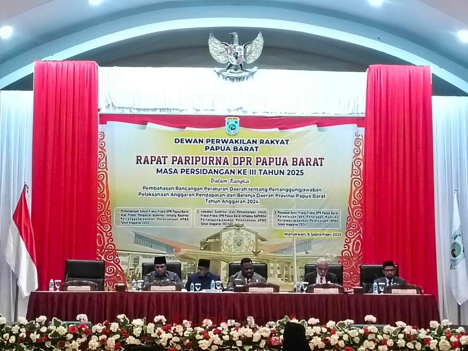 Rapat paripurna DPR Papua Barat masa sidang III digelar di Hotel Aston Niu, Manokwari, Sabtu (6/9/2025) malam. Agenda meliputi pandangan umum fraksi, jawaban gubernur, hingga penetapan Ranperda APBD 2024.