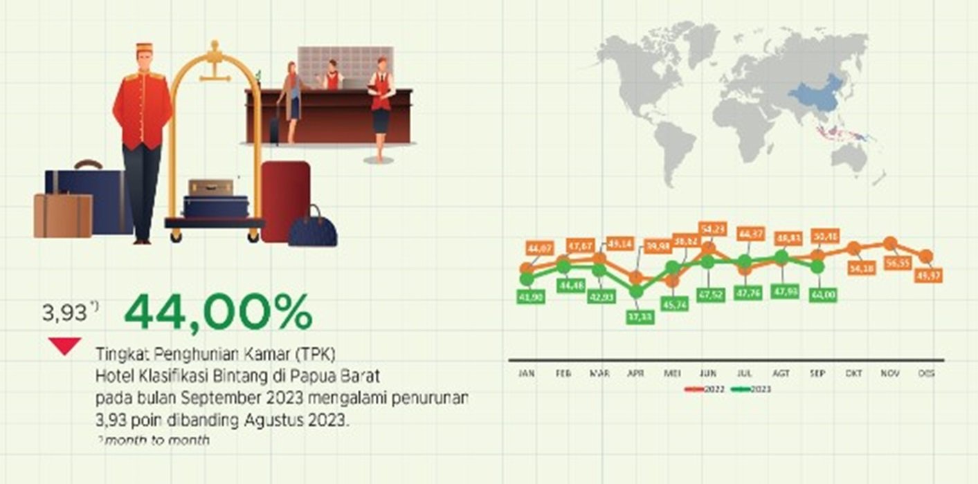 MANOKWARI, LinkPapua.com – Badan Pusat Statistik (BPS) mencatat Tingkat Penghunian Kamar (TPK) hotel bintang Provinsi Papua Barat pada September 2023 44,00 persen.