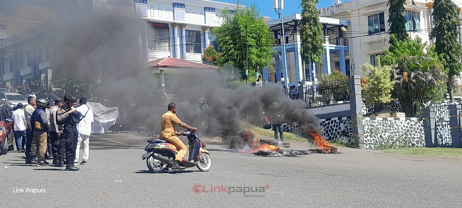 Dalam aksinya, massa membentangkan spanduk. Mereka juga membakar ban di sekitar gerbang kantor Bupati Manokwari.