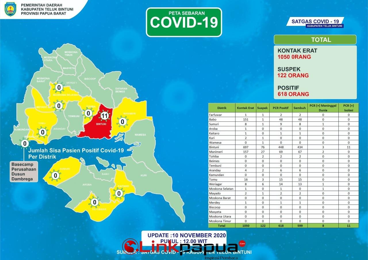 Bintuni,Linkpapuabarat.com- Tim Satgas Covid-19 Teluk Bintuni melaporkan ada 4 penambahan kasus positif pada Selasa (10/11/2020). Dengan penambahan ini, total kasus positif infeksi Corona di kabupaten ini menyentuh 618 kasus.