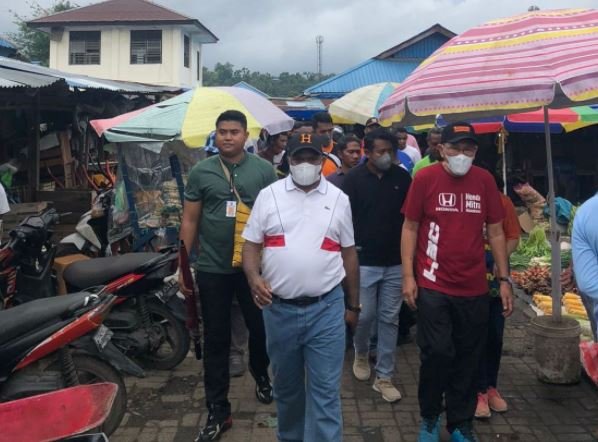 MANOKWARI, LinkPapua.com – Bupati Manokwari, Hermus Indou, meninjau progres penyelesaian pembangunan Pasar Wosi, Jumat (2/12/2022). Hermus datang ditemani Wakil Bupati (Wabup) Manokwari, Edi Budoyo.