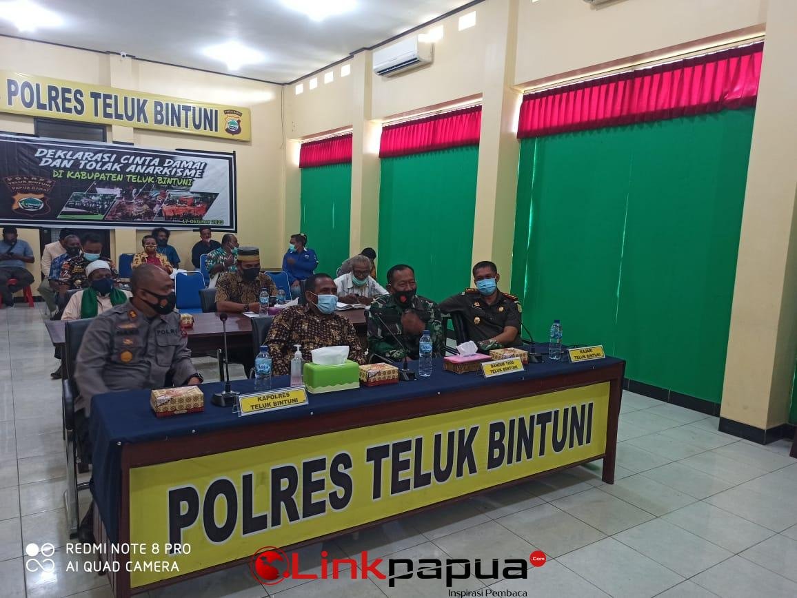 Bintuni, Linkpapuabarat.com- Forkopimda Teluk Bintuni bersama tokoh agama, masyarakat, Tokoh Pemuda, Tokoh Perempuan, Pimpinan Ormas, LSM dan seluruh stakeholder sepakat menolak segala anarkisme dan menggelar deklarasi damai.