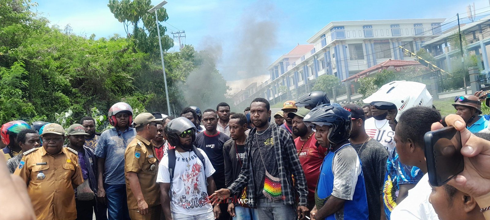 Sementara itu, tampak dilokasi sejumlah Kepala Distrik maupun kepala Kelurahan berkomunikasi dengan massa.