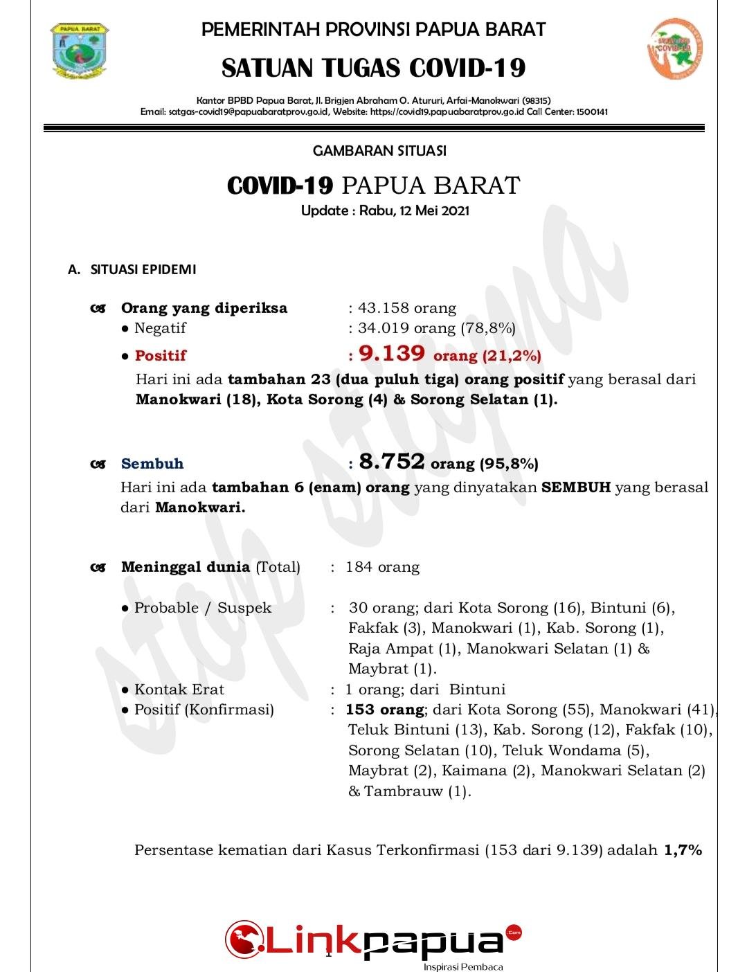 Angka positif per hari ini 153 orang, dengan rincian dari Kota Sorong (55), Manokwari (41), Teluk Bintuni (13), Kab. Sorong (12), Fakfak (10), Sorong Selatan (10), Teluk Wondama (5), Maybrat (2), Kaimana (2), Manokwari Selatan (2) dan Tambrauw (1).