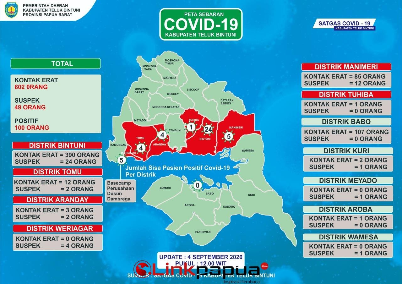 BINTUNI- Tim satgas covid-19 kabupaten Teluk Bintuni, menginformasi sampai hari ini, 4 September 2020, terdapat tambahan 11 warga Teluk Bintuni yang positif covid-19.