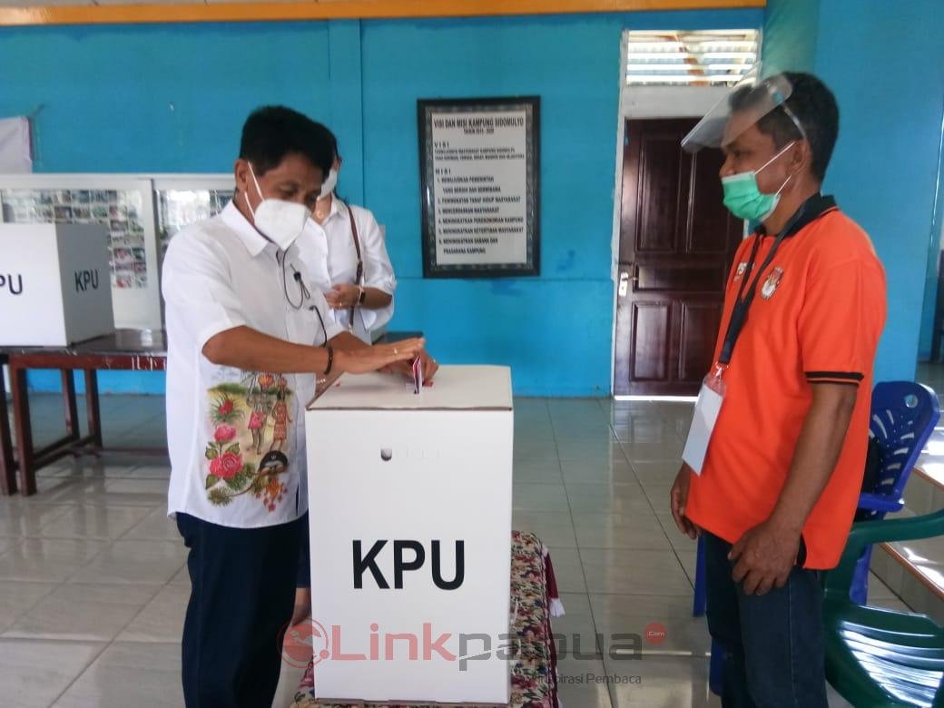 Wempi yang kompak dengan istri menggunakan kemeja putih terlihat mendatangi TPS sekitar pukul 10.30 Wit, langsung dipersilahkan menggunakan hak pilihnya di bilik suara yang telah disediakan petugas KPPS.