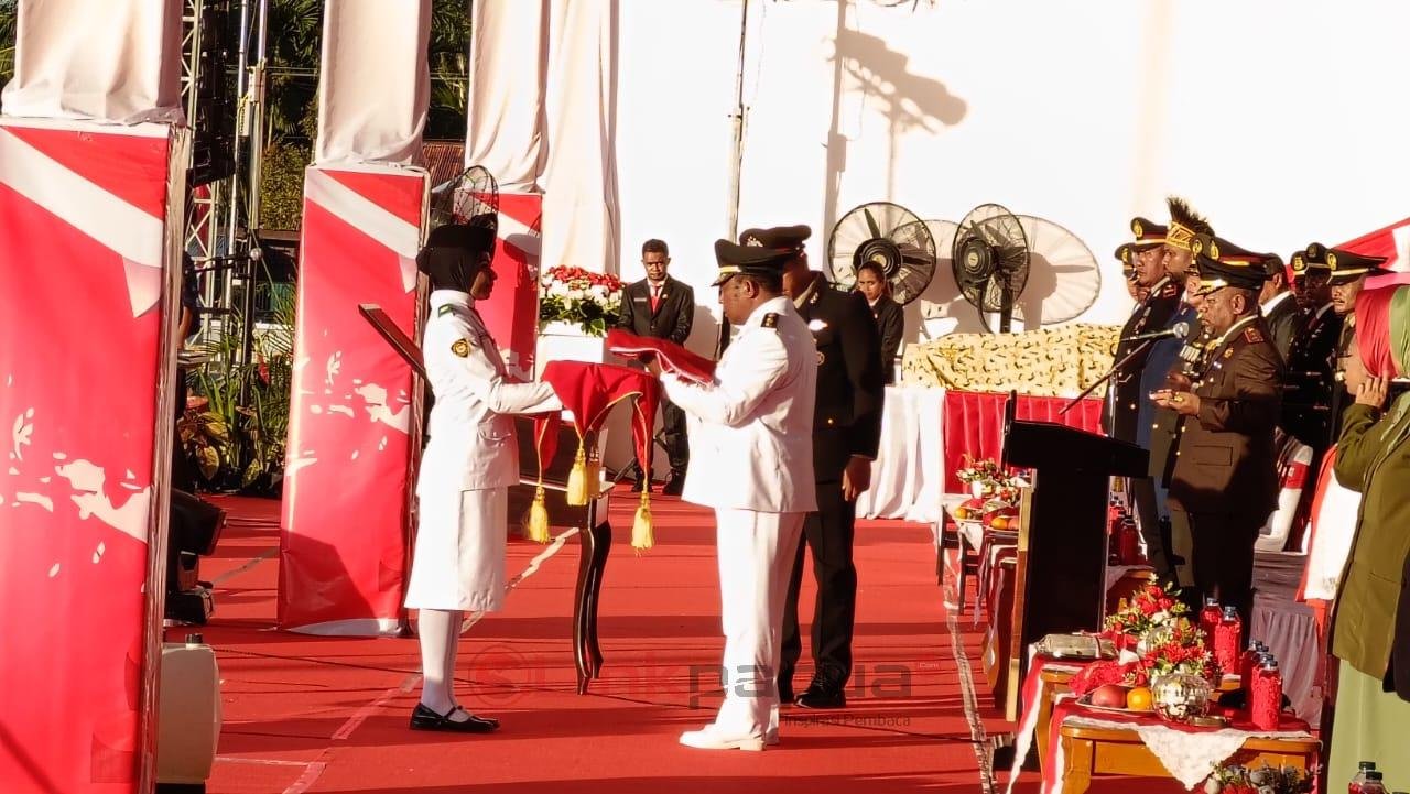 TELUK BINTUNI, LinkPapua.id – Wakil Bupati (Wabup) Teluk Bintuni Joko Lingara memimpin langsung upacara penurunan bendera merah putih peringatan HUT ke-80 kemerdekaan Republik Indonesia (RI). Upacara berlangsung di Gelanggang Argosigemerai SP5, Distrik Bintuni Timur, Minggu (17/8/2025).