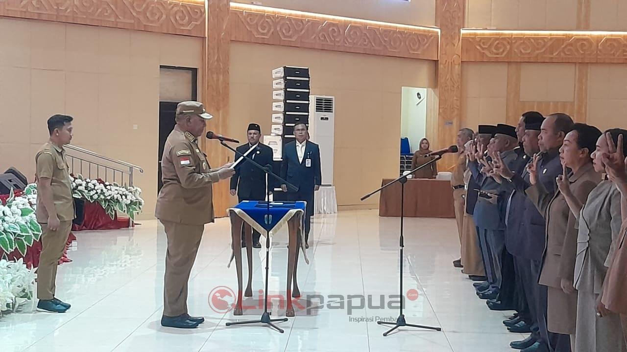 MANOKWARI, LinkPapua.com – Penjabat (Pj) Gubernur Papua Barat, Paulus Waterpauw, melantik dan mengambil sumpah jabatan sejumlah Pimpinan Tinggi Pratama, Pejabat Administrator, dan Pejabat Pengawas di lingkup Pemerintah Provinsi (Pemprov) Papua Barat. Pelantikan berlangsung di Auditorium PKK Papua Barat, Senin (16/10/2023).